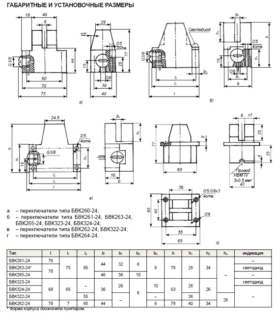 В зависимости от величины щели и ее расположения относительно плоскости крепления выпускаются следующие типы переключателей: БВК-260-24, БВК-261-24, БВК-262-24, БВК-264-24, БВК-422-24