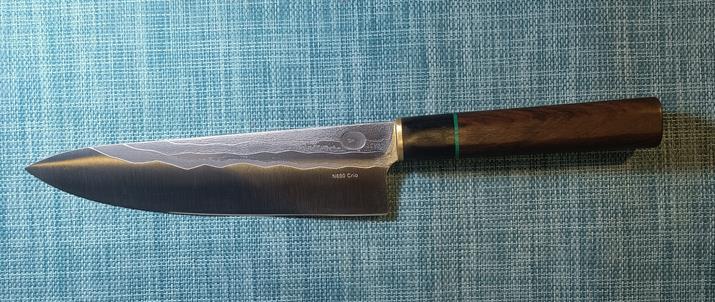 Нож кухонный "средний сантоку". Сталь Bohler N690. Твердость 61-62 HRC. Толщина в обухе 2.5 мм. Рукоять - пропитанный кавказский орех. Клинок 160х38 мм. Геометрия клинка - выпуклая линза от обуха . Ручная заточка.
