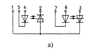 Модули оптотиристорные или комбинированные изготавливаются в пластмассовом корпусе с беспотенциальным основанием. Представляют собой комбинации тиристоров оптронных (МТОТО, рис. а), тиристора оптронного и диода (МТОД, рис. б), диода и тиристора оптронного (МДТО, рис.в)